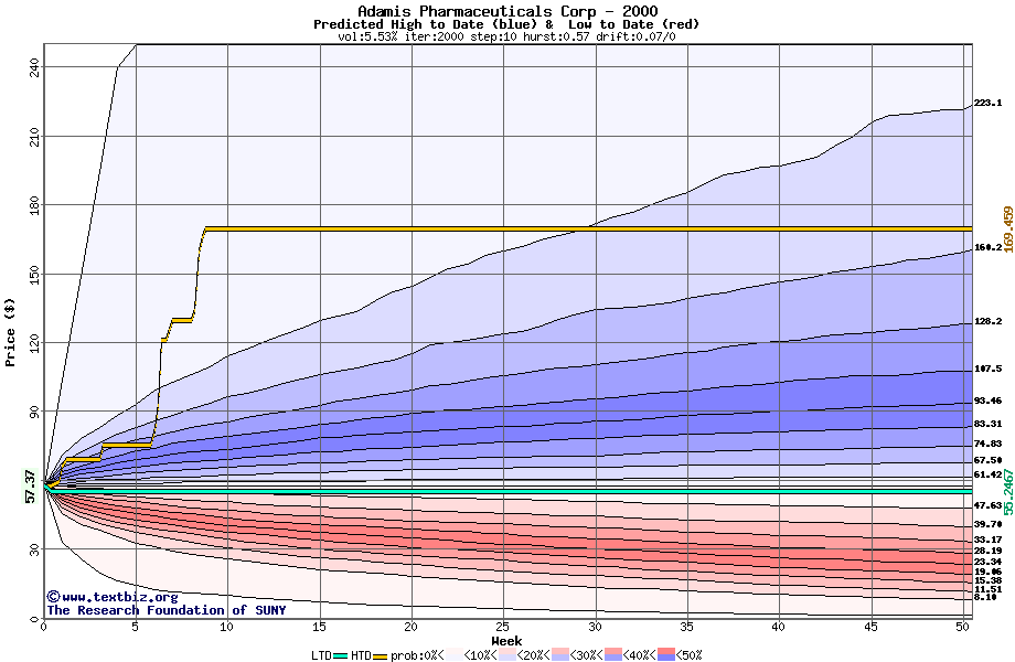 The high to date and low to date prices of the stock plotted against a random walk model for 2000 (what's this?).