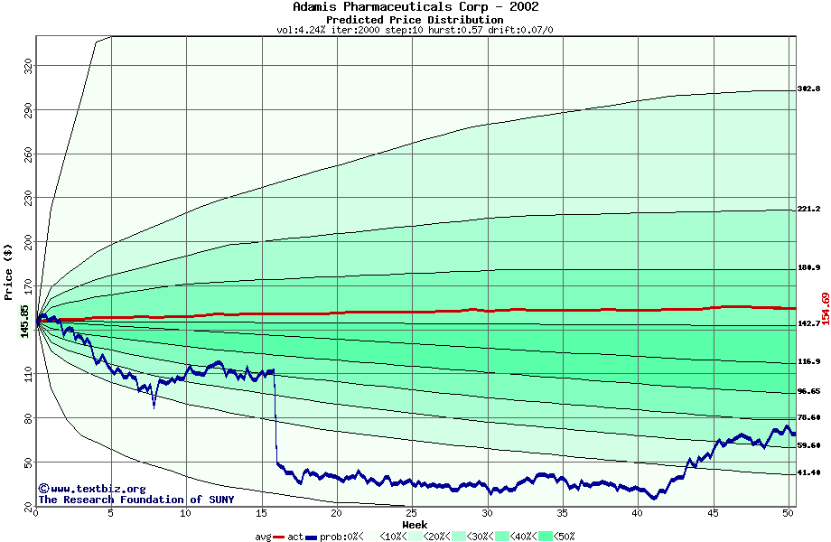 The following graph plots the year-to-date performance of the stock for 2002 compared to the probability calculated by a random walk model.