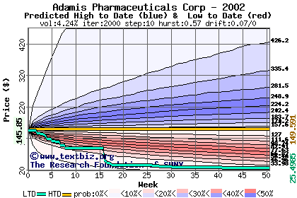 The high to date and low to date prices of the stock plotted against a random walk model for 2002 (what's this?).