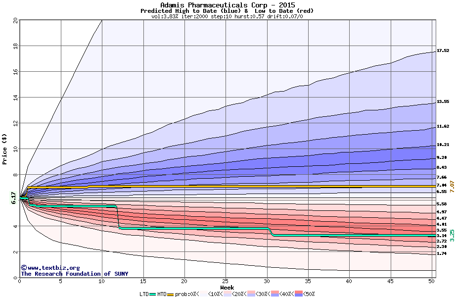 The high to date and low to date prices of the stock plotted against a random walk model for 2015 (what's this?).