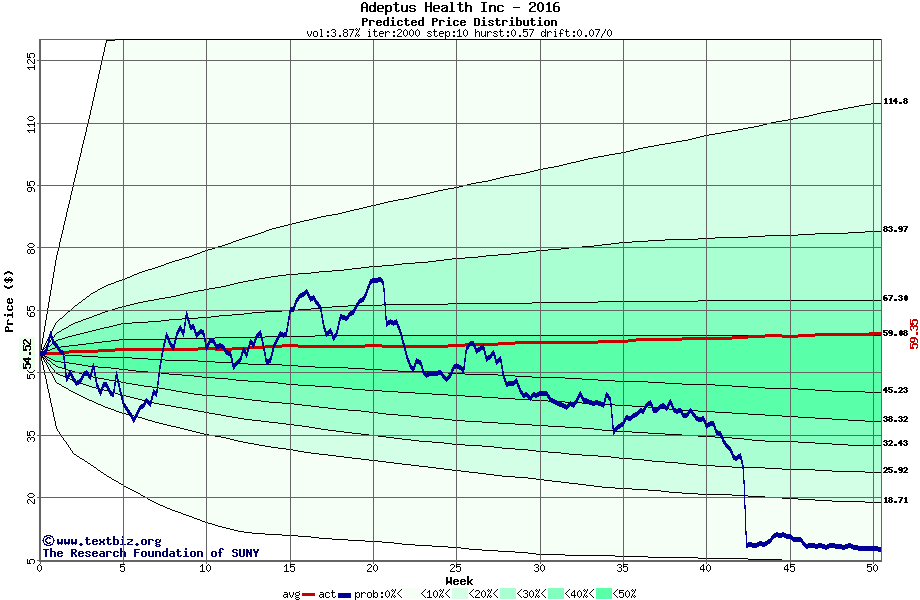The high to date and low to date prices of the stock plotted against a random walk model for 2016 (what's this?).