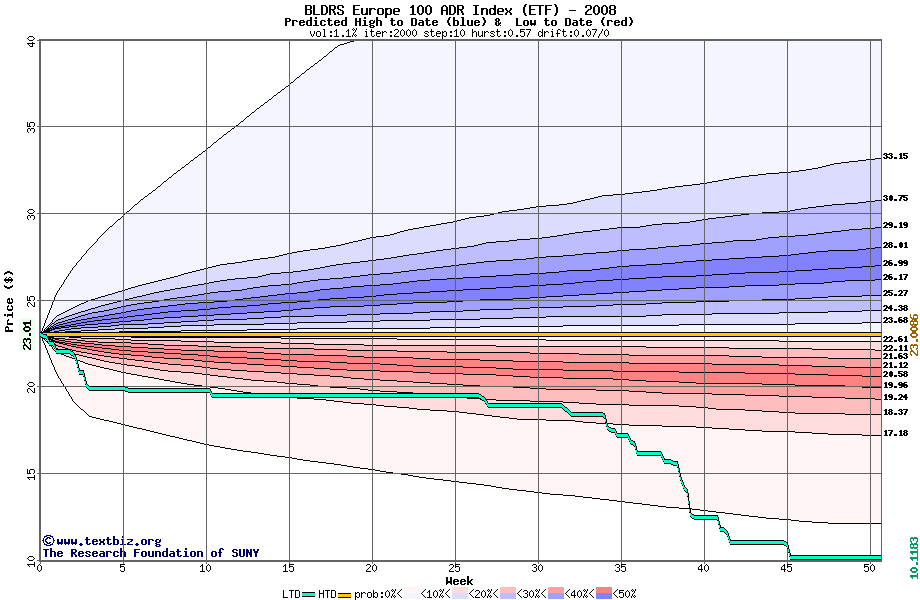 The high to date and low to date prices of the stock plotted against a random walk model for 2008 (what's this?).