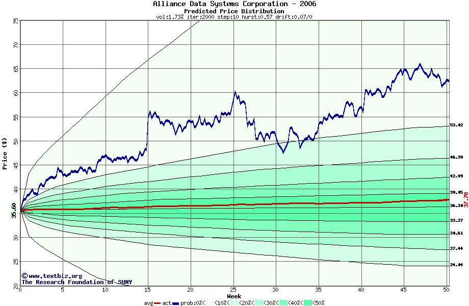 The following graph plots the year-to-date performance of the stock for 2006 compared to the probability calculated by a random walk model.