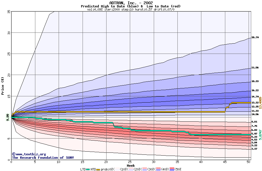The high to date and low to date prices of the stock plotted against a random walk model for 2002 (what's this?).