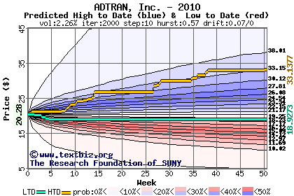 The high to date and low to date prices of the stock plotted against a random walk model for 2010 (what's this?).