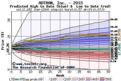 The high to date and low to date prices of the stock plotted against a random walk model for 2013 (what's this?).