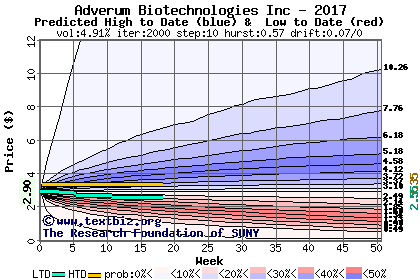 The high to date and low to date prices of the stock plotted against a random walk model for 2017 (what's this?).