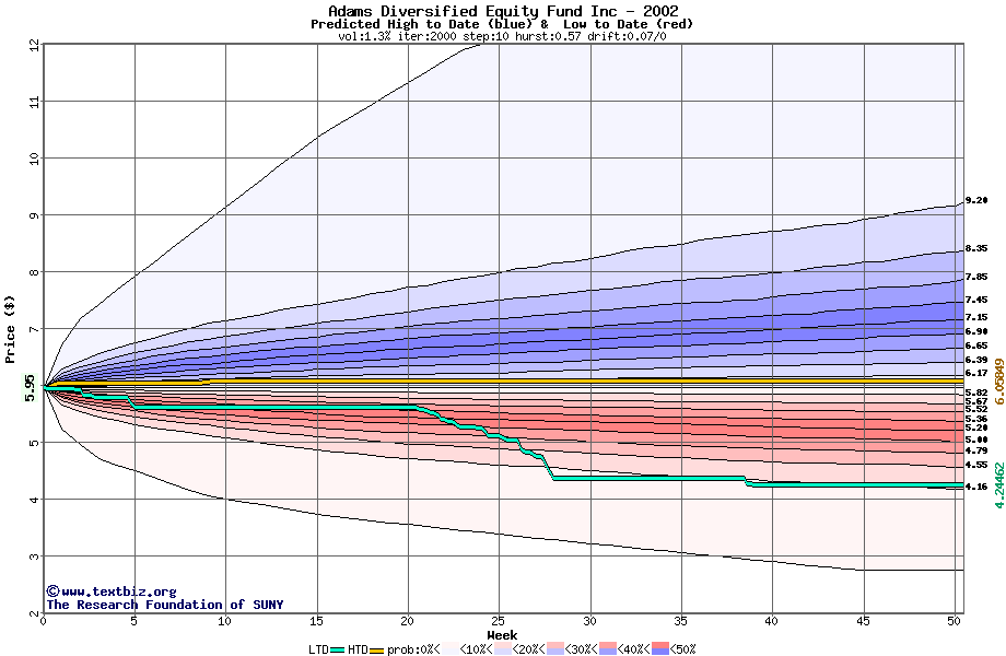 The high to date and low to date prices of the stock plotted against a random walk model for 2002 (what's this?).