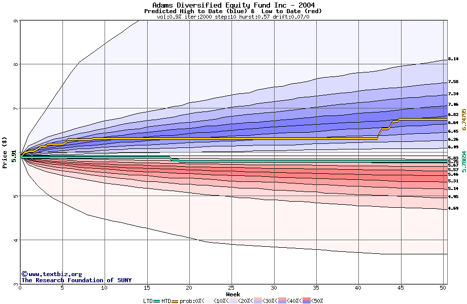 The high to date and low to date prices of the stock plotted against a random walk model for 2004 (what's this?).
