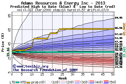 The high to date and low to date prices of the stock plotted against a random walk model for 2013 (what's this?).