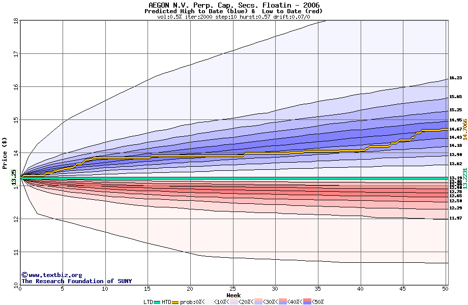The high to date and low to date prices of the stock plotted against a random walk model for 2006 (what's this?).