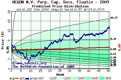 The high to date and low to date prices of the stock plotted against a random walk model for 2009 (what's this?).
