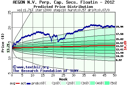 The high to date and low to date prices of the stock plotted against a random walk model for 2012 (what's this?).