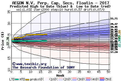 The high to date and low to date prices of the stock plotted against a random walk model for 2017 (what's this?).