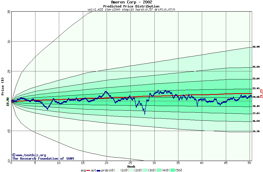 The following graph plots the year-to-date performance of the stock for 2002 compared to the probability calculated by a random walk model.