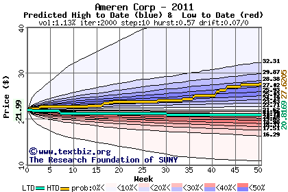 The high to date and low to date prices of the stock plotted against a random walk model for 2011 (what's this?).