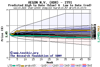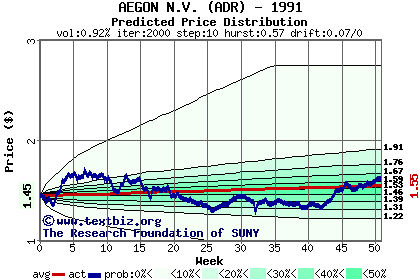 The high to date and low to date prices of the stock plotted against a random walk model for 1991 (what's this?).