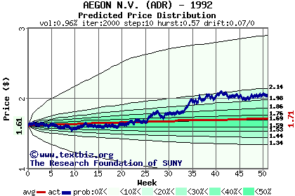 The high to date and low to date prices of the stock plotted against a random walk model for 1992 (what's this?).