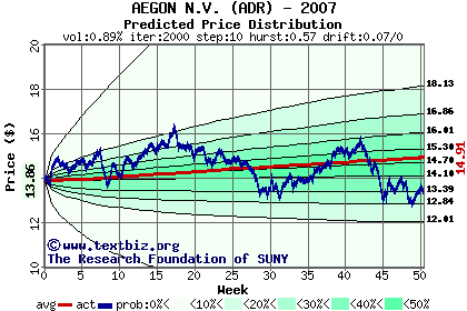 The high to date and low to date prices of the stock plotted against a random walk model for 2007 (what's this?).