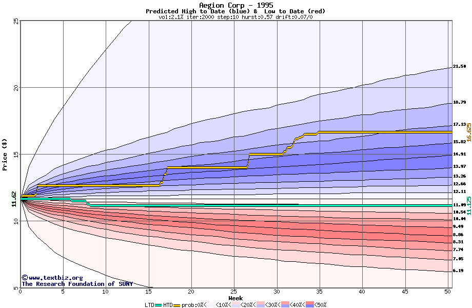 The high to date and low to date prices of the stock plotted against a random walk model for 1995 (what's this?).