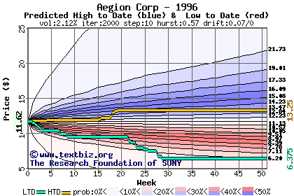 The high to date and low to date prices of the stock plotted against a random walk model for 1996 (what's this?).