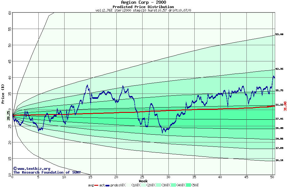 The following graph plots the year-to-date performance of the stock for 2000 compared to the probability calculated by a random walk model.