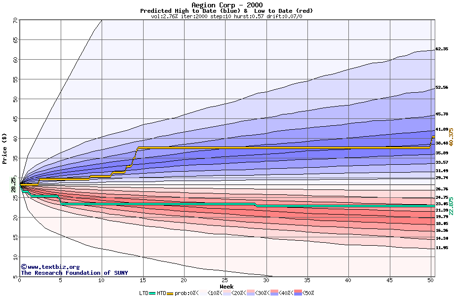 The high to date and low to date prices of the stock plotted against a random walk model for 2000 (what's this?).