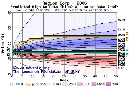 The high to date and low to date prices of the stock plotted against a random walk model for 2006 (what's this?).