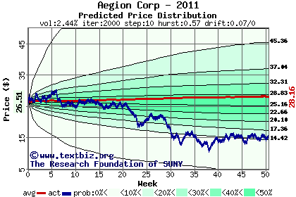 The high to date and low to date prices of the stock plotted against a random walk model for 2011 (what's this?).
