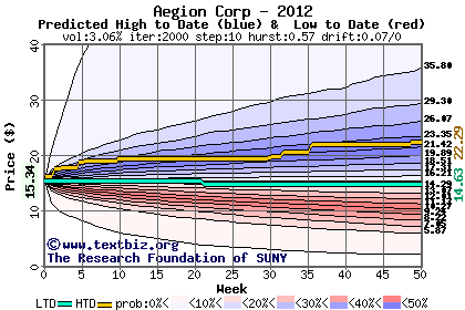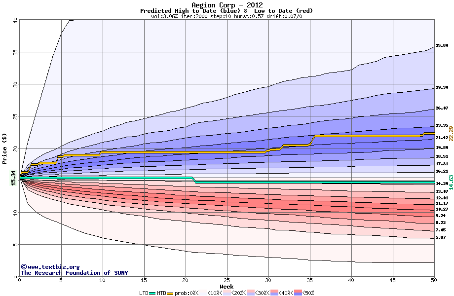 The high to date and low to date prices of the stock plotted against a random walk model for 2012 (what's this?).