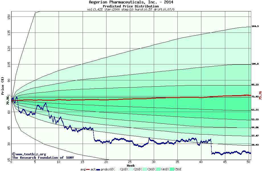 The following graph plots the year-to-date performance of the stock for 2014 compared to the probability calculated by a random walk model.