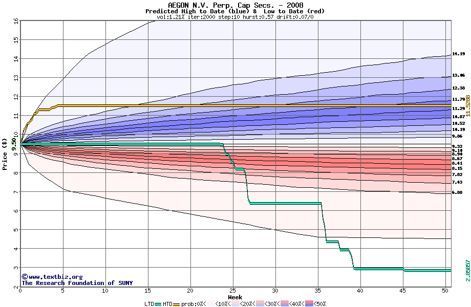 The high to date and low to date prices of the stock plotted against a random walk model for 2008 (what's this?).