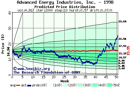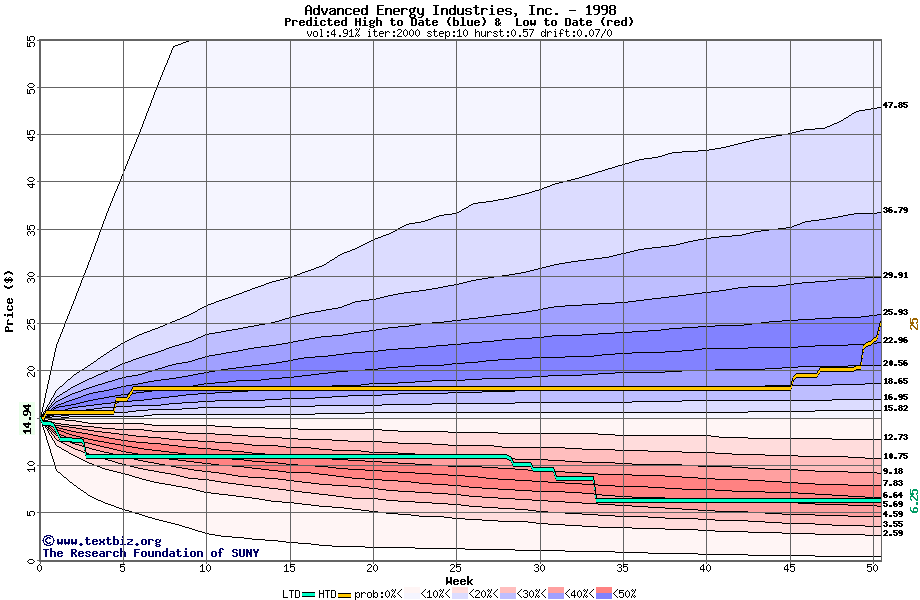The high to date and low to date prices of the stock plotted against a random walk model for 1998 (what's this?).