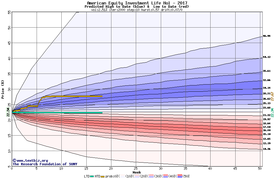 The high to date and low to date prices of the stock plotted against a random walk model for 2017 (what's this?).