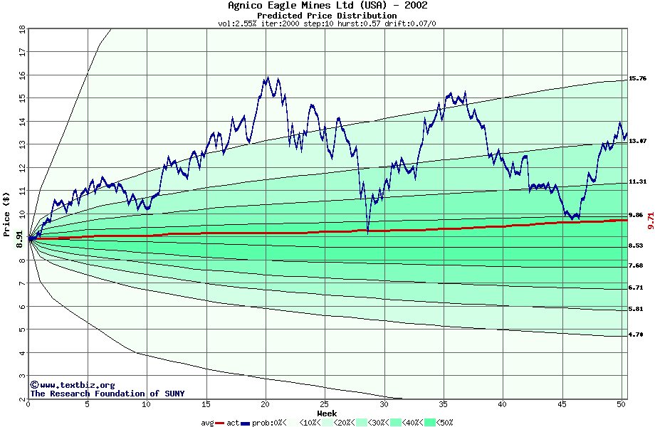 The high to date and low to date prices of the stock plotted against a random walk model for 2002 (what's this?).