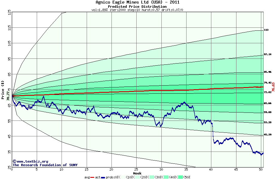 The high to date and low to date prices of the stock plotted against a random walk model for 2011 (what's this?).