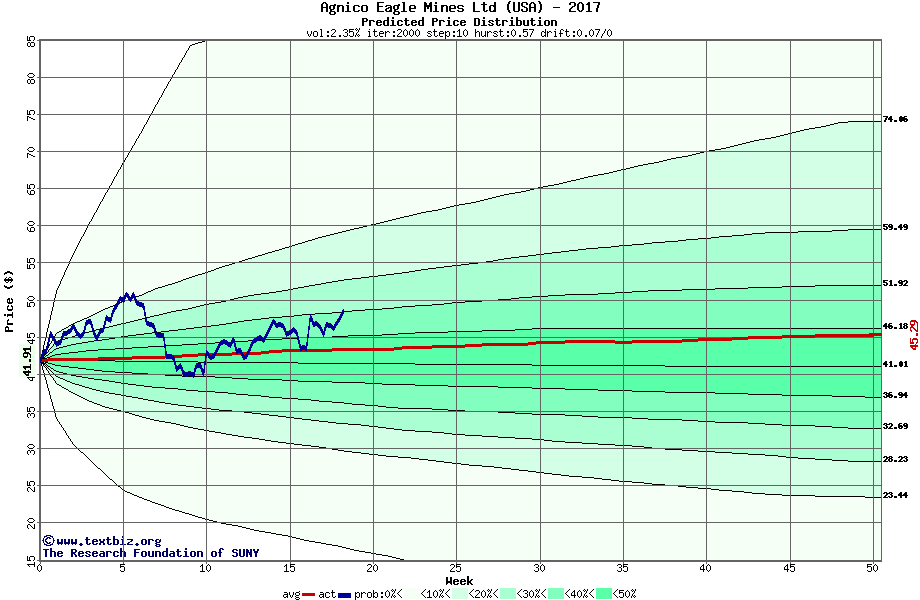 The following graph plots the year-to-date performance of the stock for 2017 compared to the probability calculated by a random walk model.