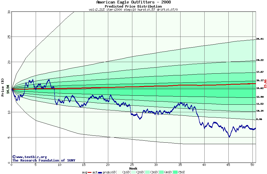 The high to date and low to date prices of the stock plotted against a random walk model for 2008 (what's this?).