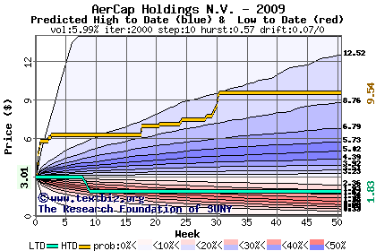 The high to date and low to date prices of the stock plotted against a random walk model for 2009 (what's this?).