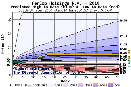 The high to date and low to date prices of the stock plotted against a random walk model for 2010 (what's this?).