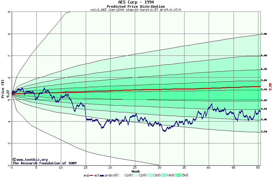 The high to date and low to date prices of the stock plotted against a random walk model for 1994 (what's this?).