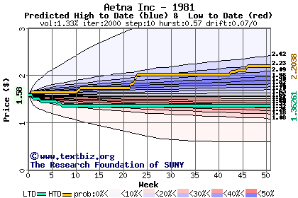 The high to date and low to date prices of the stock plotted against a random walk model for 1981 (what's this?).