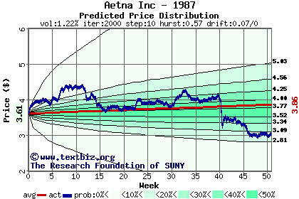 The high to date and low to date prices of the stock plotted against a random walk model for 1987 (what's this?).