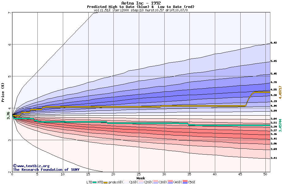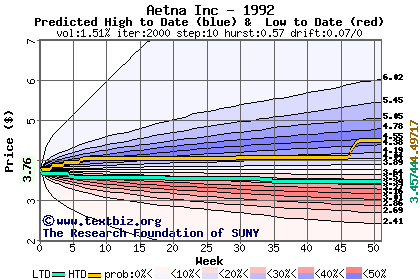 The high to date and low to date prices of the stock plotted against a random walk model for 1992 (what's this?).