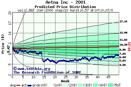 The high to date and low to date prices of the stock plotted against a random walk model for 2001 (what's this?).
