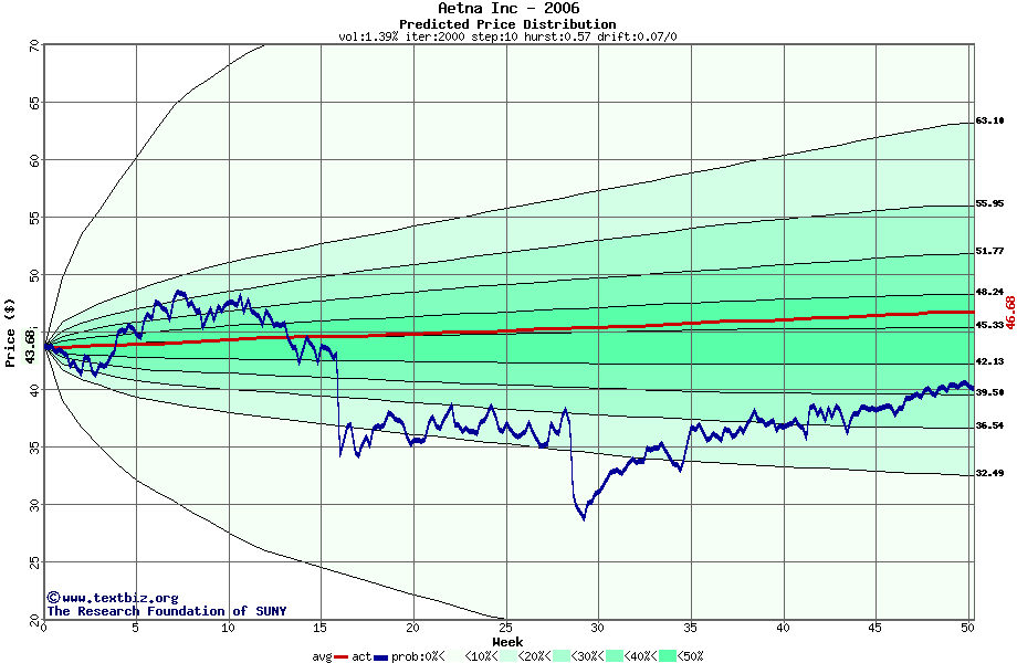 The following graph plots the year-to-date performance of the stock for 2006 compared to the probability calculated by a random walk model.