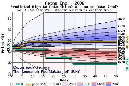 The high to date and low to date prices of the stock plotted against a random walk model for 2006 (what's this?).