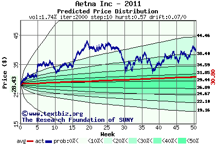 The high to date and low to date prices of the stock plotted against a random walk model for 2011 (what's this?).