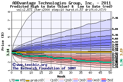 The high to date and low to date prices of the stock plotted against a random walk model for 2011 (what's this?).