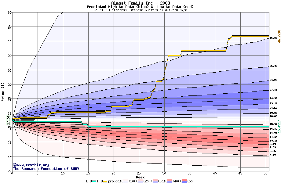 The high to date and low to date prices of the stock plotted against a random walk model for 2008 (what's this?).